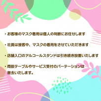 つきまして当店では感染防止のための対応を以下の通りに変更いたします。