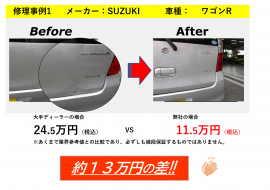 そこでまず、バックドアとリヤバンパー交換ではなく、2ヶ所共鈑金修理での提案をさせていただきました。また、前回のお客様と同様にディーラーとは工賃の作業単価が異なること、WEBでの予約特典として工賃を10%値引きさせていただいたことで、なんと今回も合計13万円の大幅減額に成功し、半値以下の11.5万円で修理を承りました。