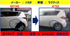 今回は、既存のお客様が自費での修理をしたいので、何とか安く修理をしてもらえないかとご相談に来店されました。お車を確認させていただきましたところ、本来であれば、左リヤドア交換・左クオーター鈑金塗装となるところですが、左リヤドアも鈑金塗装のお見積りを提案させていただきました。ドアも鈑金塗装をお願いしたいとのことでしたので、日曜日の朝お預かりして、その間工場の無料代車をお乗りいただき、二日後の火曜日夕方修理完了となりお引渡しさせていただきました。新品部品と交換したのかと思うほどきれいに修理されている上、44,000円の減額に成功し、大変満足していただけました。今後もお客様に喜んでいただけるサービスと技術の向上に真面目に取り組んでまいります。
