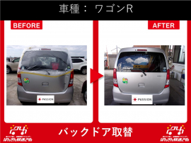 今回入庫したワゴンRは、バックドアとリアガラスに大きな損傷があり、部品取替をすることになりました。